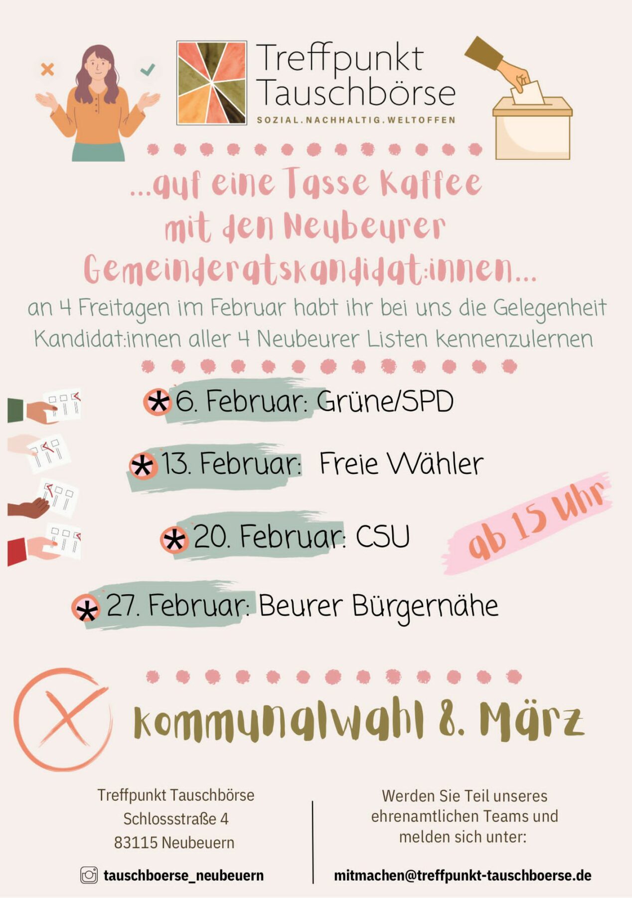Kennenlernen unserer Gemeinderatskandidaten beim „Treffpunkt Tauschbörse“ in der Schlossstraße 4 (altes Rathaus)